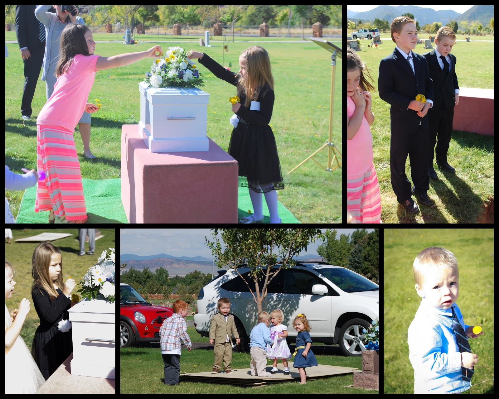At this time when my grief felt most intense, the innocence of the children came to the rescue. Our sweet nieces and nephews began to lovingly toss their hilarious bouquets of dandelions into the grave, blowing kisses and then (the tiny ones) running off to play tag and explore the other headstones. Their joy in the midst of this sorrow was such a sweet reminder that life would go on and that there was much happiness ahead to be enjoyed.